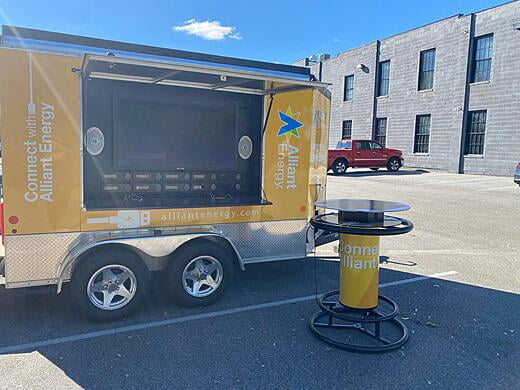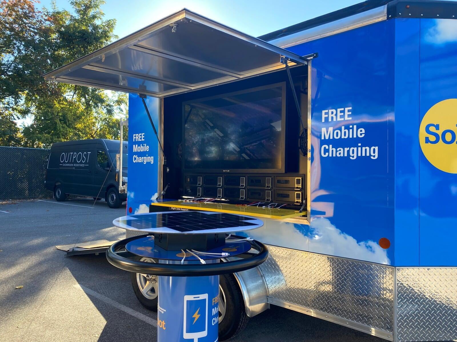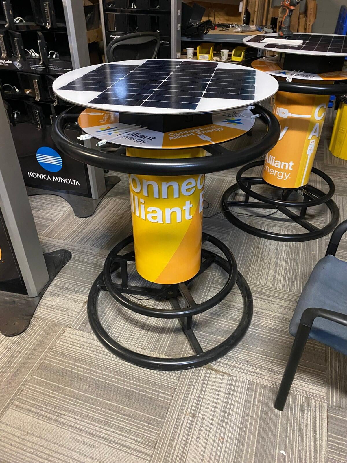 Use the Sun to Stay Connected. The POWER UP CONNECT™ solar charging tables feature a 68 watt solar panel as the table top. Energy is stored in a 50Ah battery and a power cable is incorporated to recharge when the Sun is not available. Real-time volt meters display the voltage available so you always know the battery status.